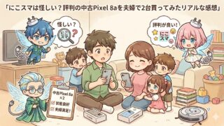 にこスマは怪しい?評判の中古Pixel 8aを夫婦で2台(Bグレード93,600円・バッテリー97%)買ってみた3児パパの本音レビュー!伊藤忠グループの安心感、Google公式7年サポート(2031年まで)の強み、外装の状態、メルカリとの比較、国内唯一取り扱いのGoogle認定再生品という選択肢、y.u mobile+povo2.0の格安SIM運用まで、中古スマホ初挑戦で得た感動と節約効果を実体験で徹底解説します。