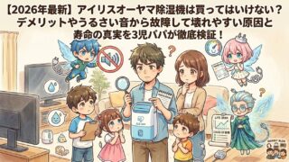 家電製品【2026年最新】アイリスオーヤマ除湿機は買ってはいけない?うるさい・壊れやすい噂を3児パパが検証 部屋干しが乾かない悩みを前提に、過去の除湿機トラブル経験を踏まえた失敗回避の判断基準を公開。IJD-P20-H・IJH-L160-Hなど主要型式を比較し、家庭環境に合う1台の選び方を具体的に解説します。 2026.04.12家電製品
