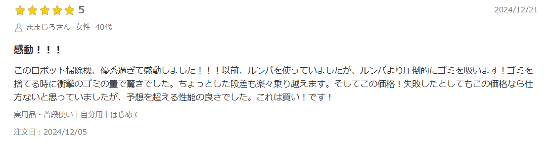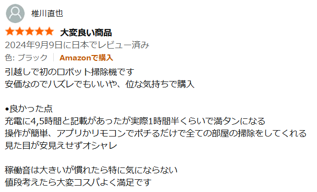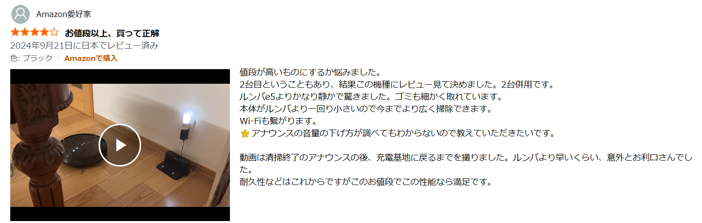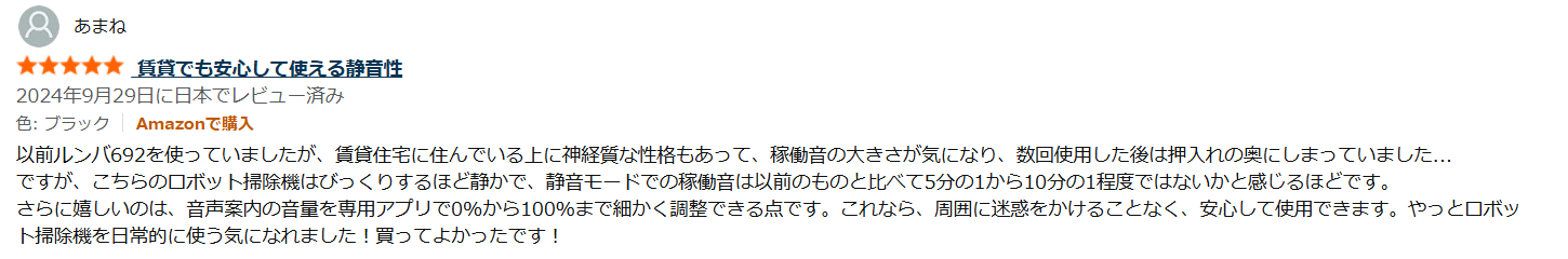 あるレビューでは「音が大きい」とされる一方、別のユーザーからは「ルンバe5よりかなり静かで驚きました」「賃貸でも安心して使える」と静音性を称賛する声もあります。