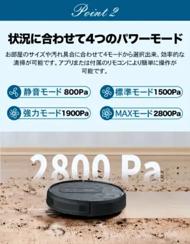 最大吸引力は2800Paと、同価格帯のモデルの中では非常に高い数値です。
