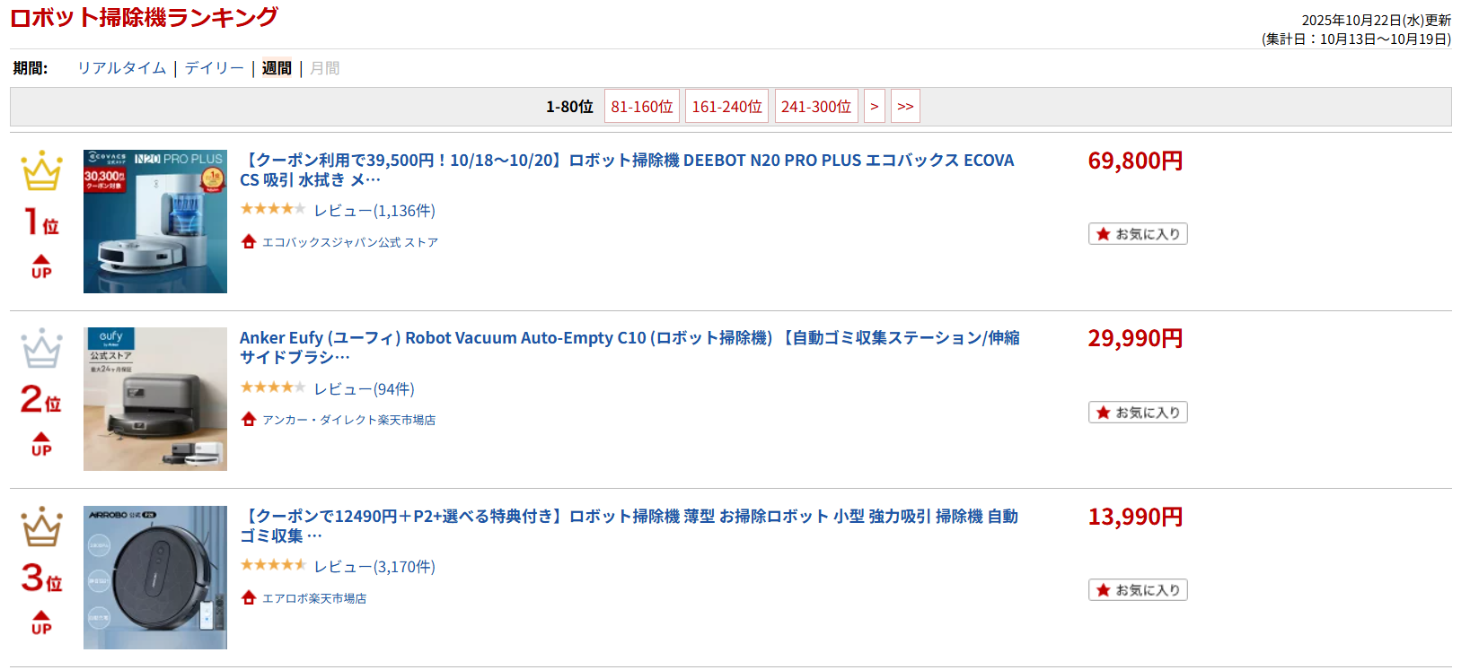 楽天市場「ロボット掃除機ランキング」より引用 2025年10月22日(水)更新(集計日:10月13日~10月19日)