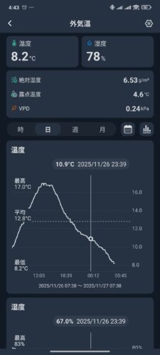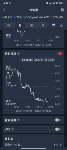 👇【我が家の24h暖房+象印スチーム加湿器】エアコン設定温度26度、室温25℃(2階は22~23度)、外気温17度~8度、絶対湿度は屋外6g/㎥に対して「象印スチーム加湿器のみ」で11g/㎥と快適。