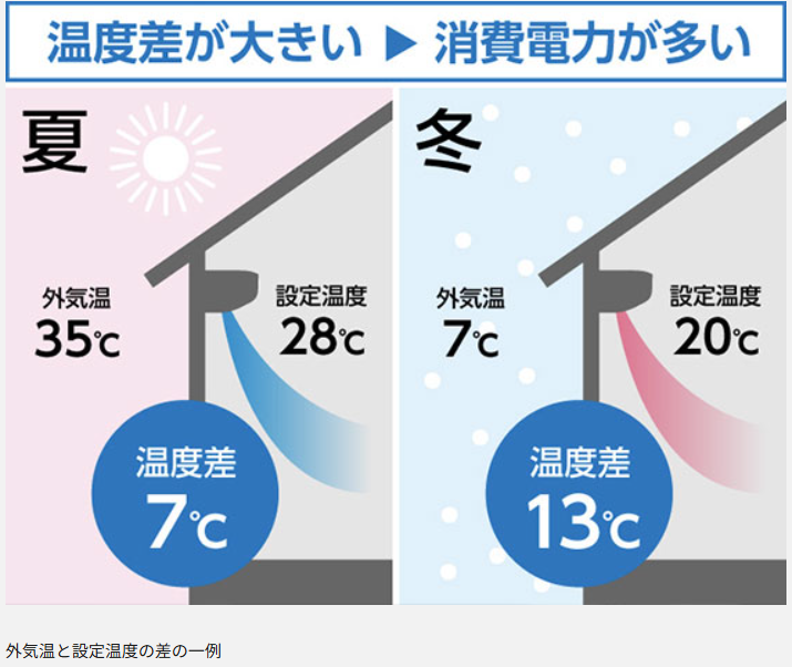 このように、冬の暖房は夏よりも大きな温度差を克服する必要があるため、より多くのエネルギーを消費するのです。
