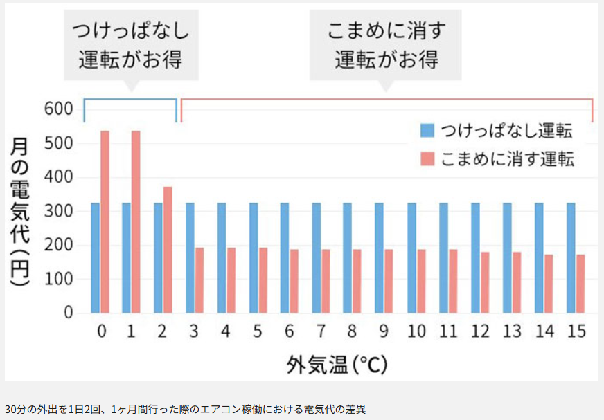 ただし、夜間など外気温が下がってきた時間帯や、数時間にわたる長時間の外出の場合は、こまめに電源を切る方が節約になります。