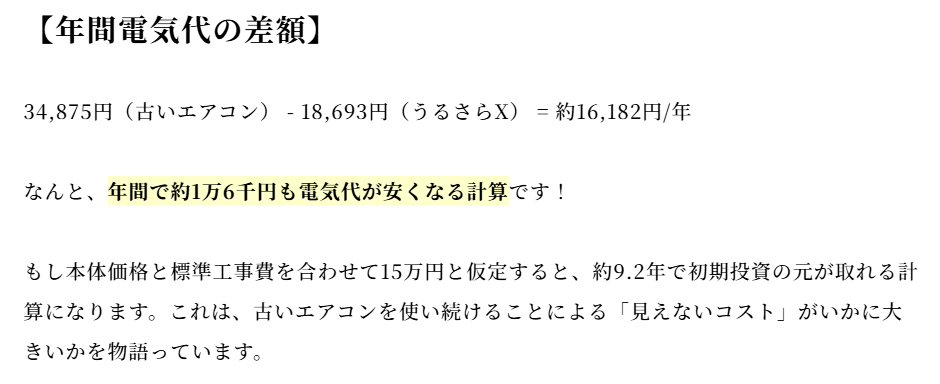 仮に、劣化した10年前のエアコン(6畳用)を最新の省エネモデルであるダイキン「うるさらX」に買い替えた場合、年間の電気代は約16,000円も安くなるという試算になります。