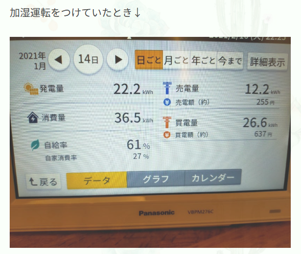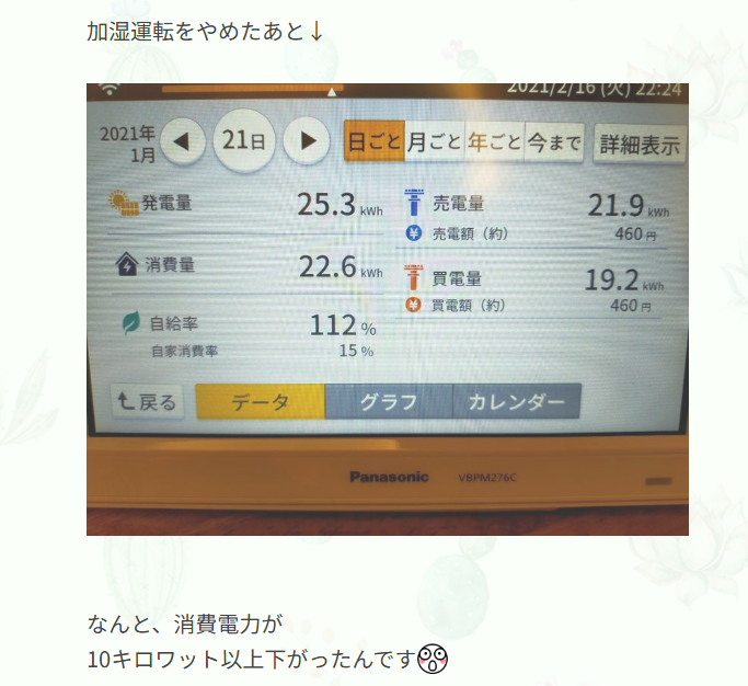あるユーザーレビューでは、「加湿暖房」から加湿機能をオフにしただけで、1日の消費電力が10kWh以上(約310円)も削減できたという報告があります。