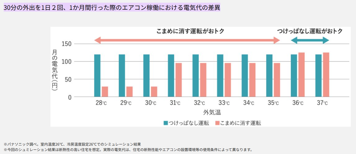 ダイキンの実験でも、30分程度の短い外出であればつけっぱなしの方がお得という結果が出ていますが、これはあくまで短時間に限った話です。