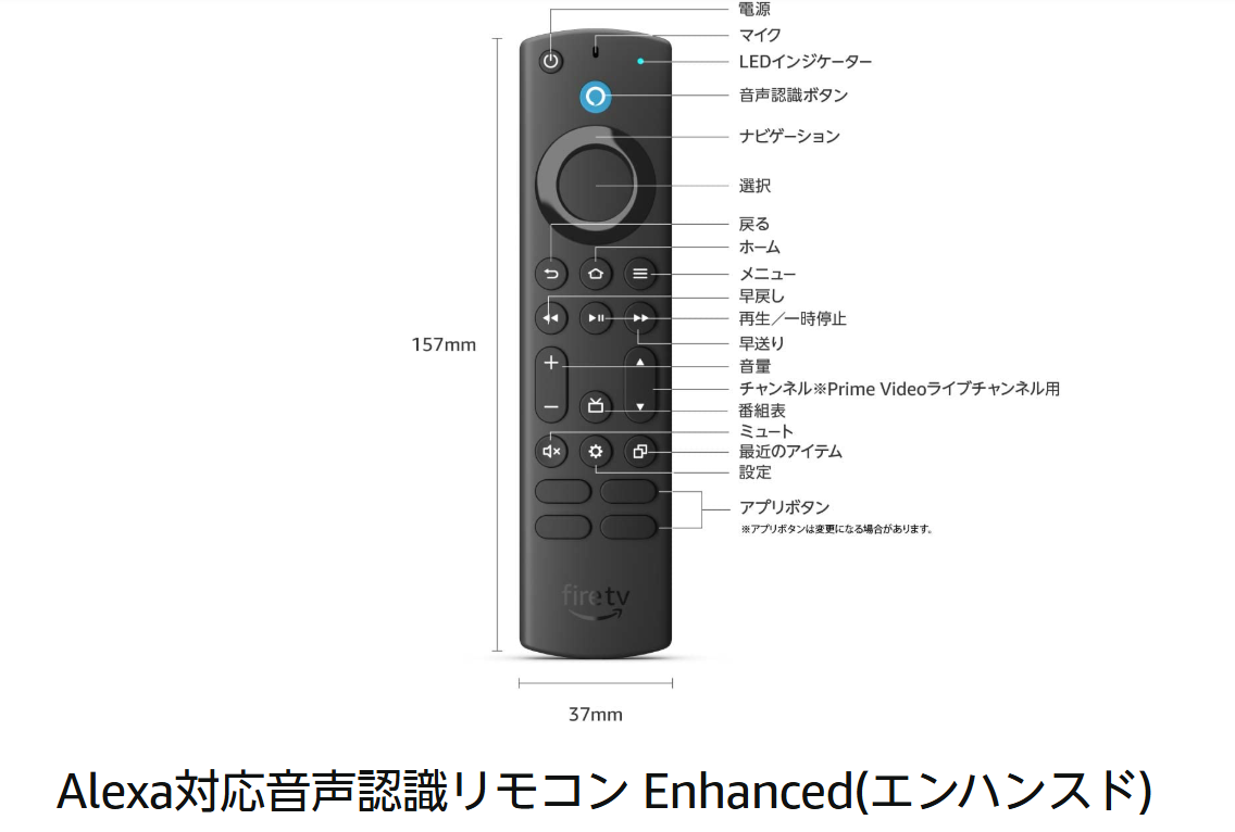 Fire TV Stick 4K Maxには「Alexa対応音声認識リモコン Enhanced」という、少し長くてボタンが多いリモコンが付属します。