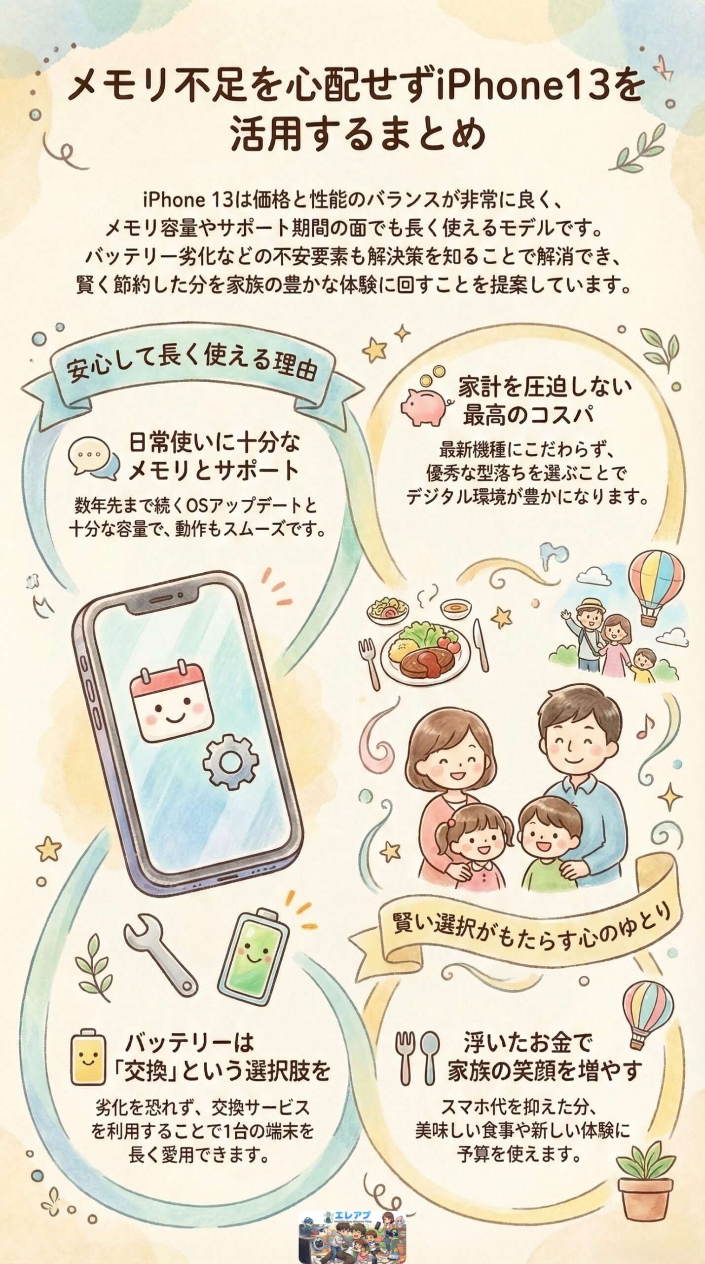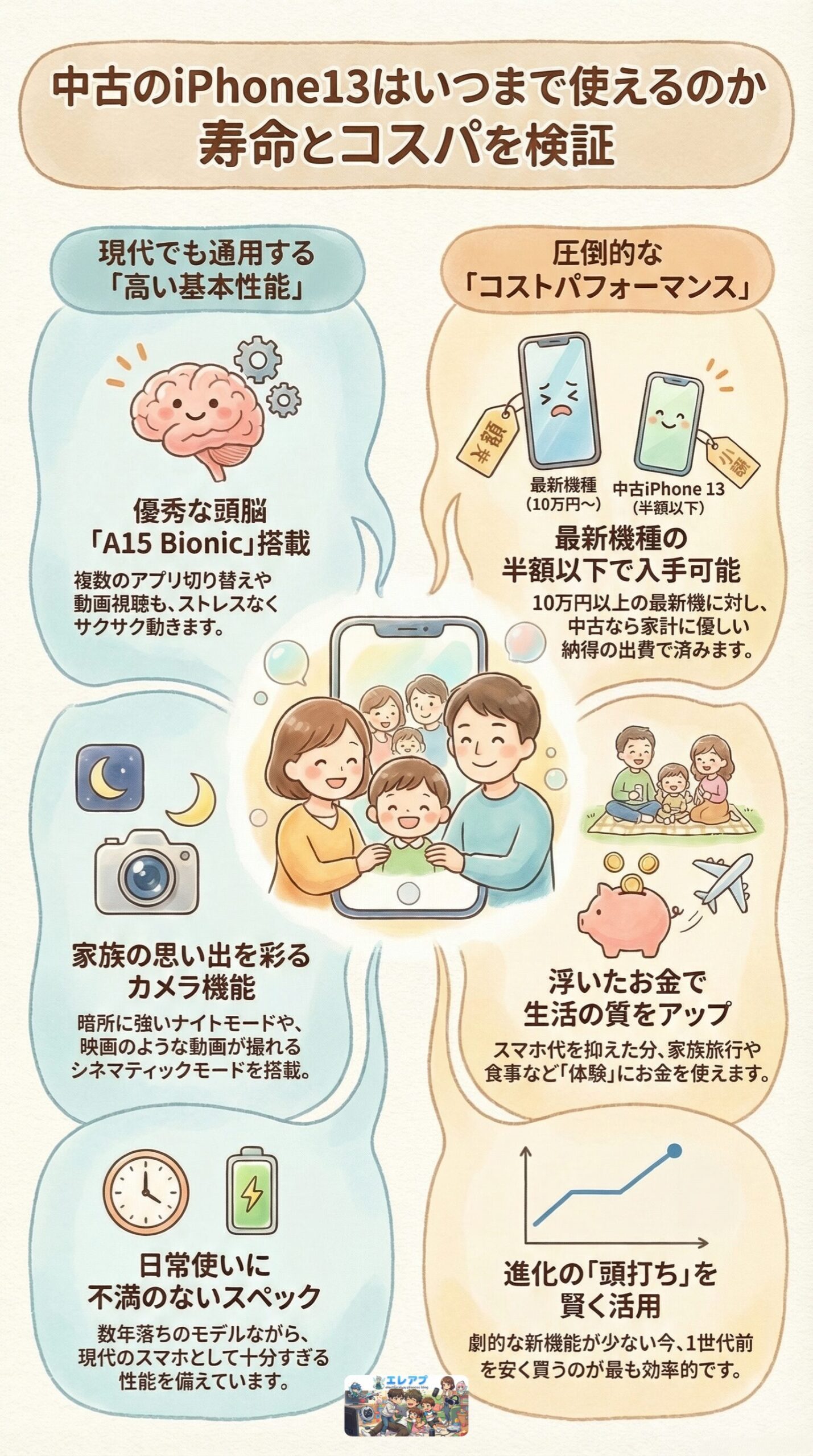 古い機種への不安であれこれ悩むより浮いたスマホ代で家族の思い出作りに投資するのが一番だと信じています。٩( ”ω” )و