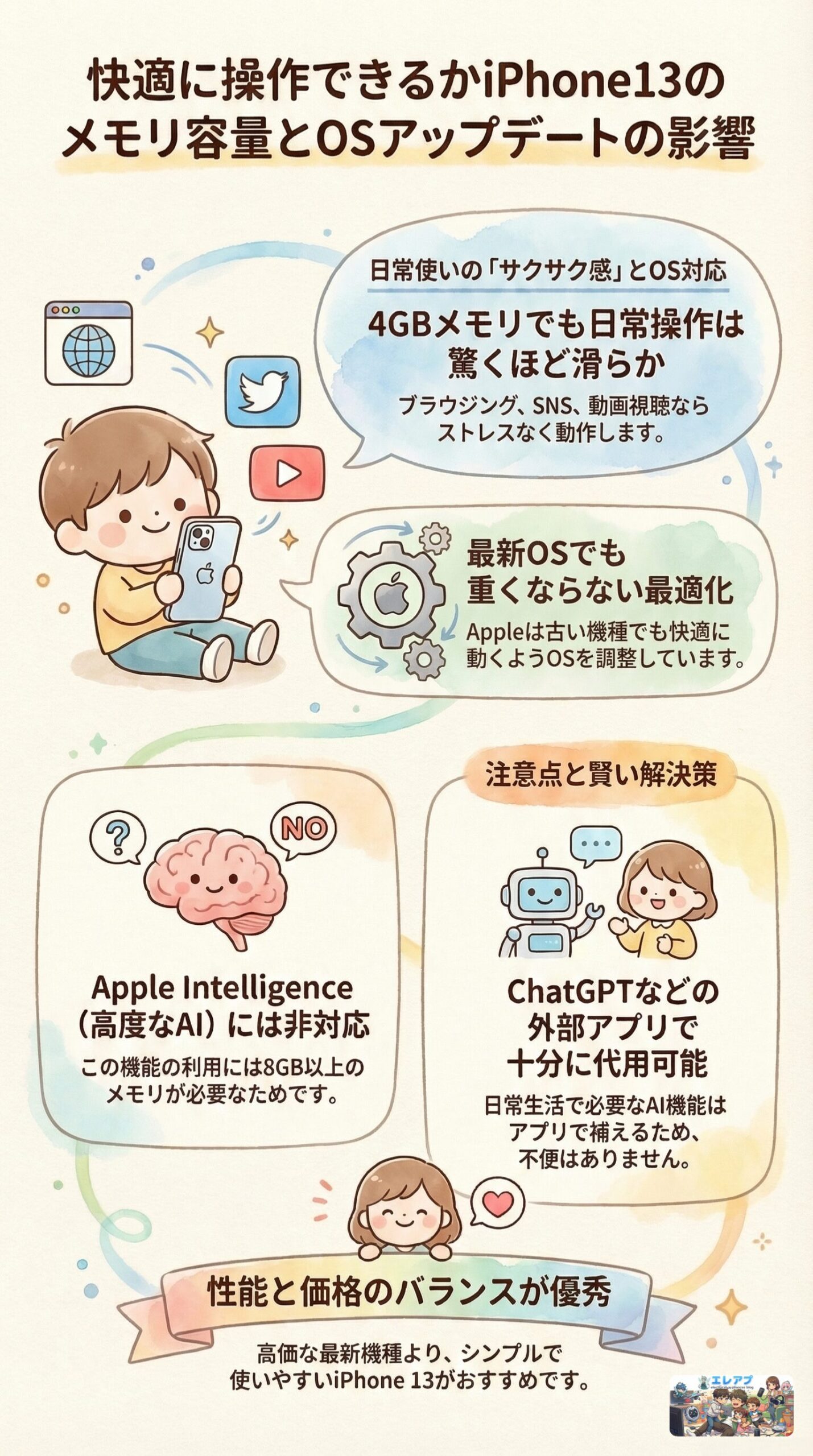 さらに、気になるiPhone13のサポート終了時期や、iPhone13のメモリ容量が現代のアプリに耐えられるのかという点まで徹底的に掘り下げていきます。