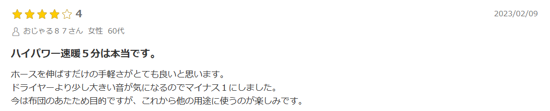 - 「家族が多いので、ターボで次々と布団を温められるのが助かる」