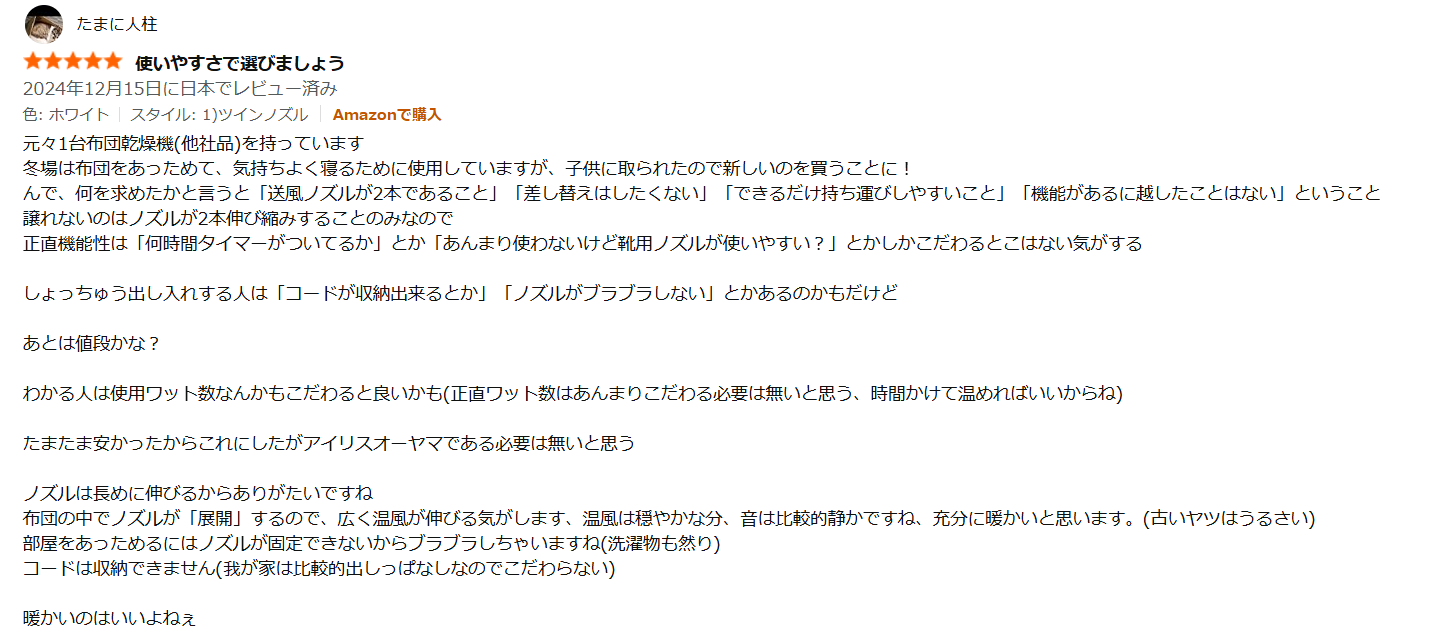 - シングルノズルのため、布団の隅々まで温風を届けるには「手動でホースを動かす必要がある」という手間が報告されています。