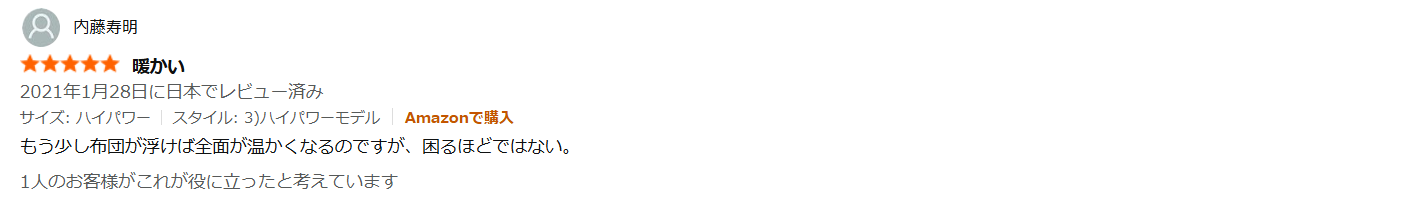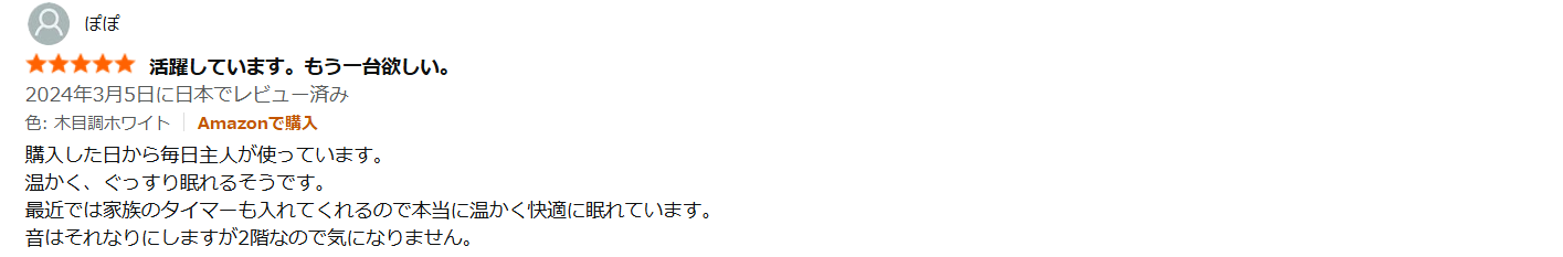 - 「すごい轟音が出ますが、温かい布団で眠れます。ただ音はかなり気になります」
