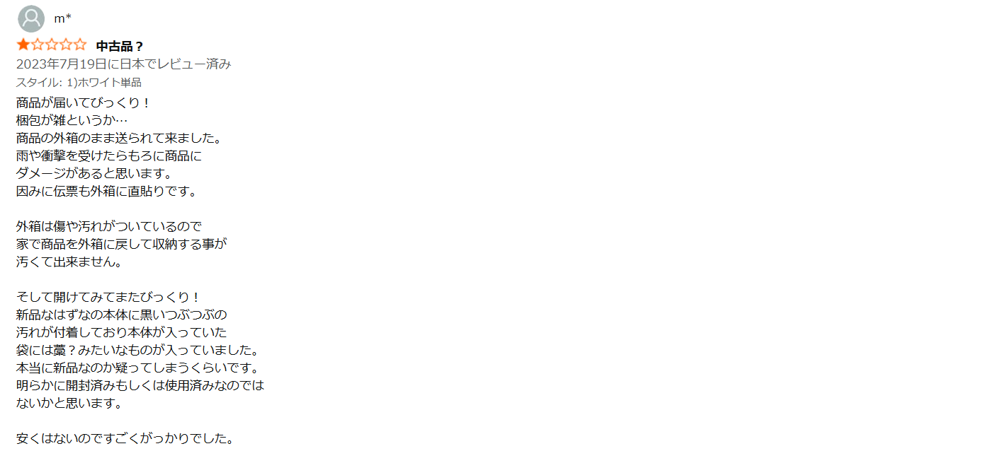 - 「商品の箱に直接伝票が貼られて送られてきた。箱が汚れていて驚いた」という配送・梱包に関する具体的な不満。