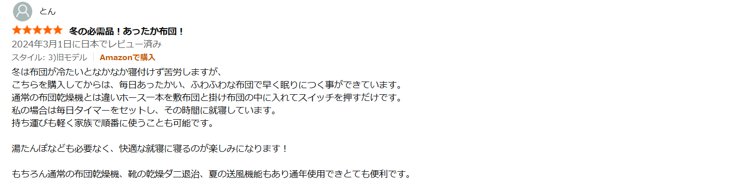- 「布団に入ってからモゾモゾしていたのが、乾燥機を使ってからは秒で眠れるようになった」