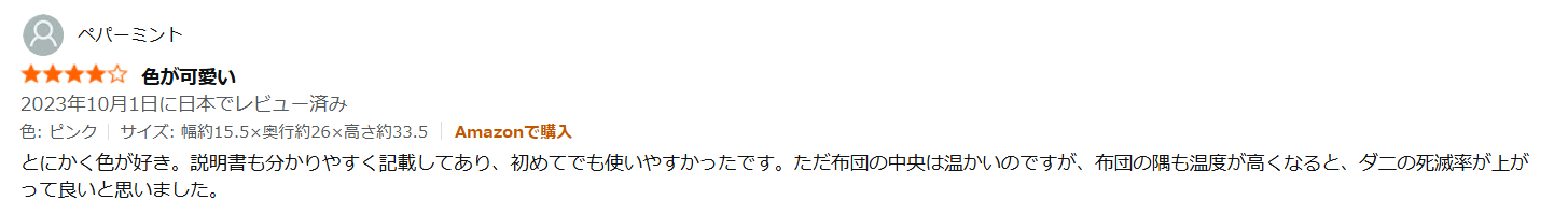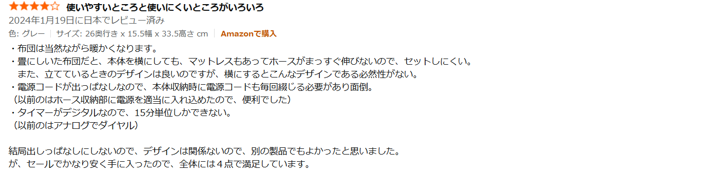 - 冬場の布団温めに関しては高評価で、「冬モード1時間でほかほかになる」「布団に入った瞬間に幸せを感じる」といった感想が多く見られます。