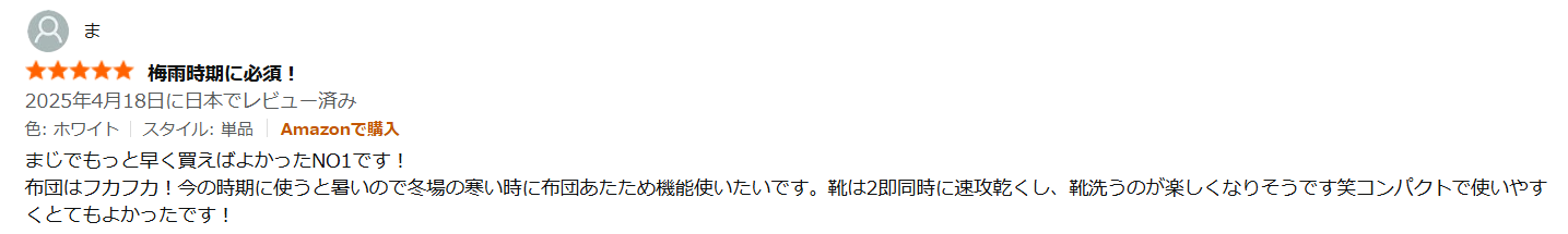 - 「部屋に置きっ放しでも違和感がない」「見た目が可愛い」という声が圧倒的に多いです。従来の布団乾燥機は「隠す家電」でしたが、これは「見せる家電」として評価されています。
