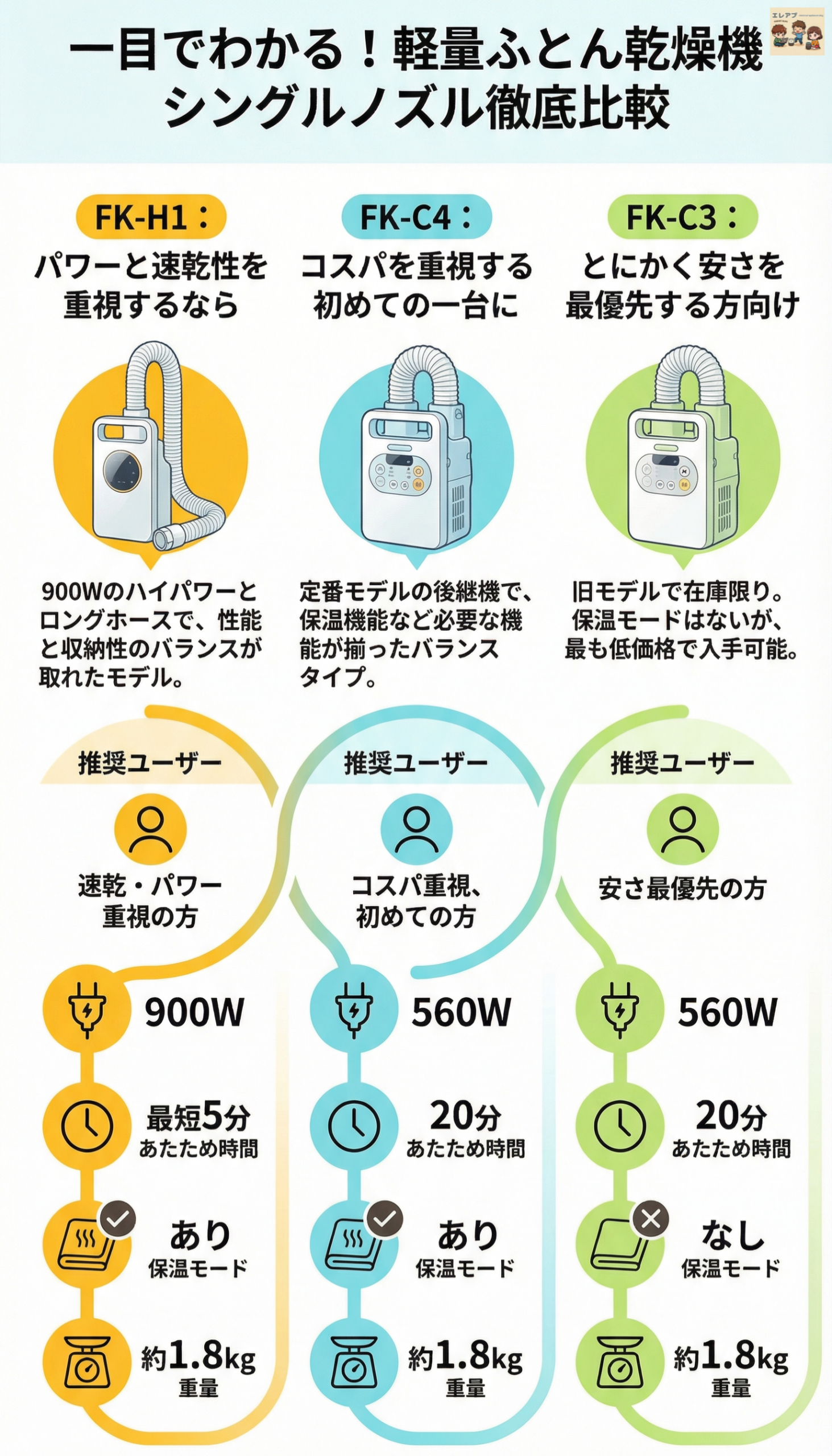 - FK-WH2(ハイパワー): 圧倒的なパワー(1150W)と進化したノズル(サイドフラップ)で、布団の隅々まで温風を届ける最上位モデルです。保温モードも搭載されています。