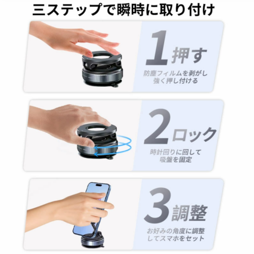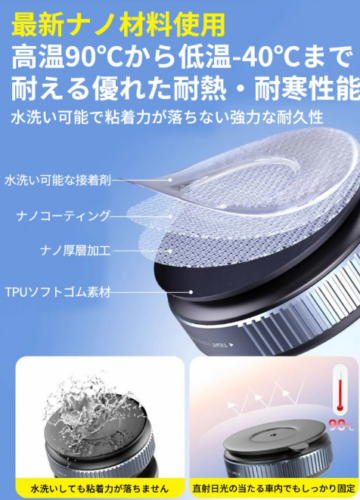 仕組み 粘着性のあるゲル素材を使った吸盤を、ダッシュボードやフロントガラスなどの平らな面に押し付け、真空状態にして固定するタイプです。レバー操作でさらに強く吸着させるモデルが主流です。