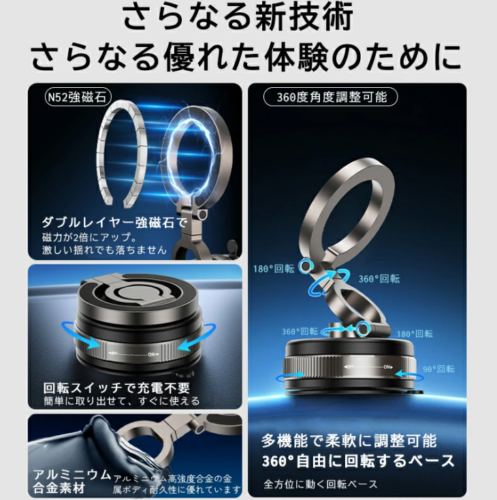 - 磁力の強さが重要: 製品によって磁力に差があります。磁力が弱いと、少しの段差やカーブの衝撃でスマホがずれたり、最悪の場合落下したりする危険性があります。