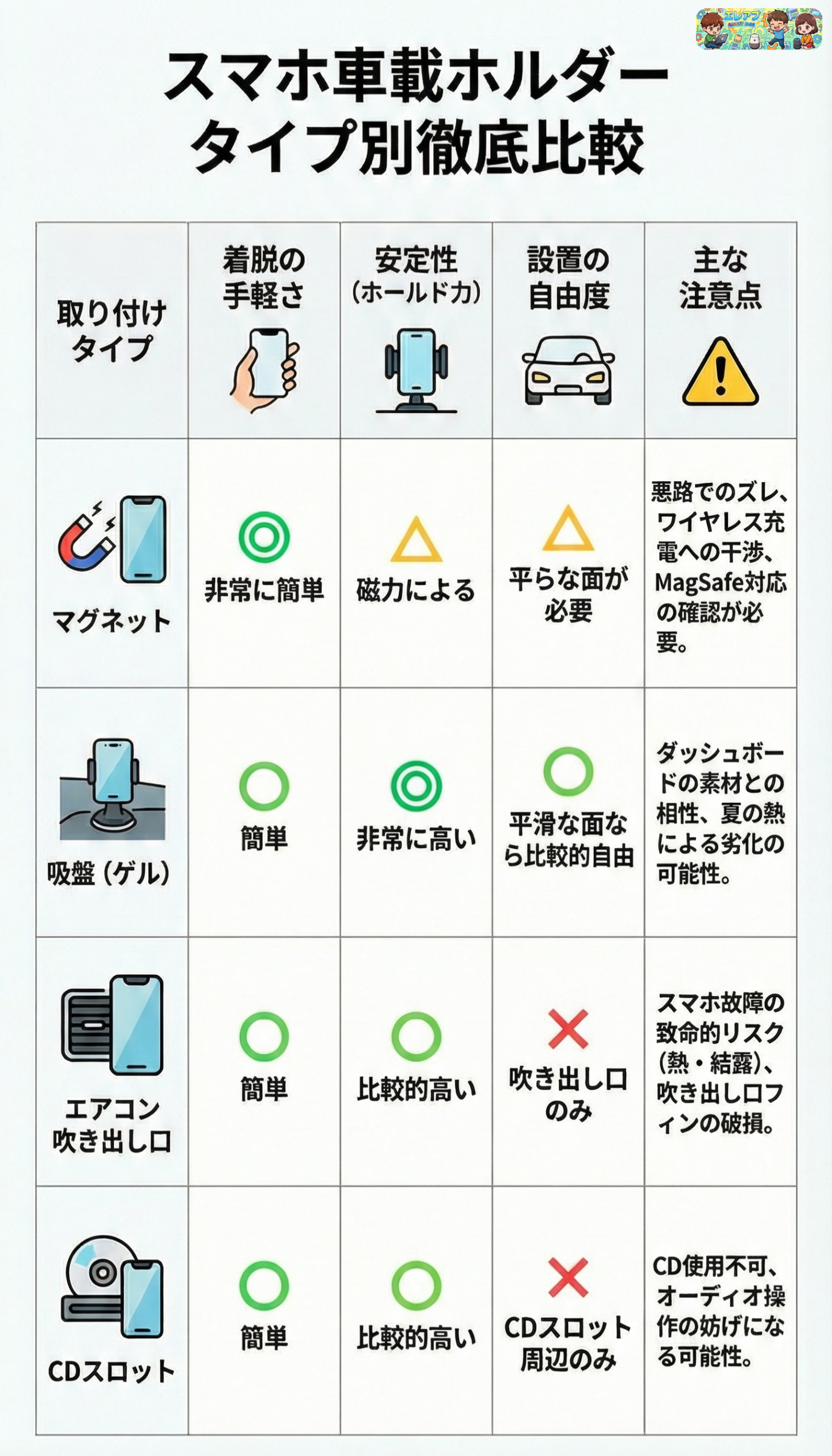 タイプ選びが重要:自分の車や使い方に合わせて「マグネット」「吸盤」「エアコン吹き出し口」「CDスロット」から最適なものを選ぶ。