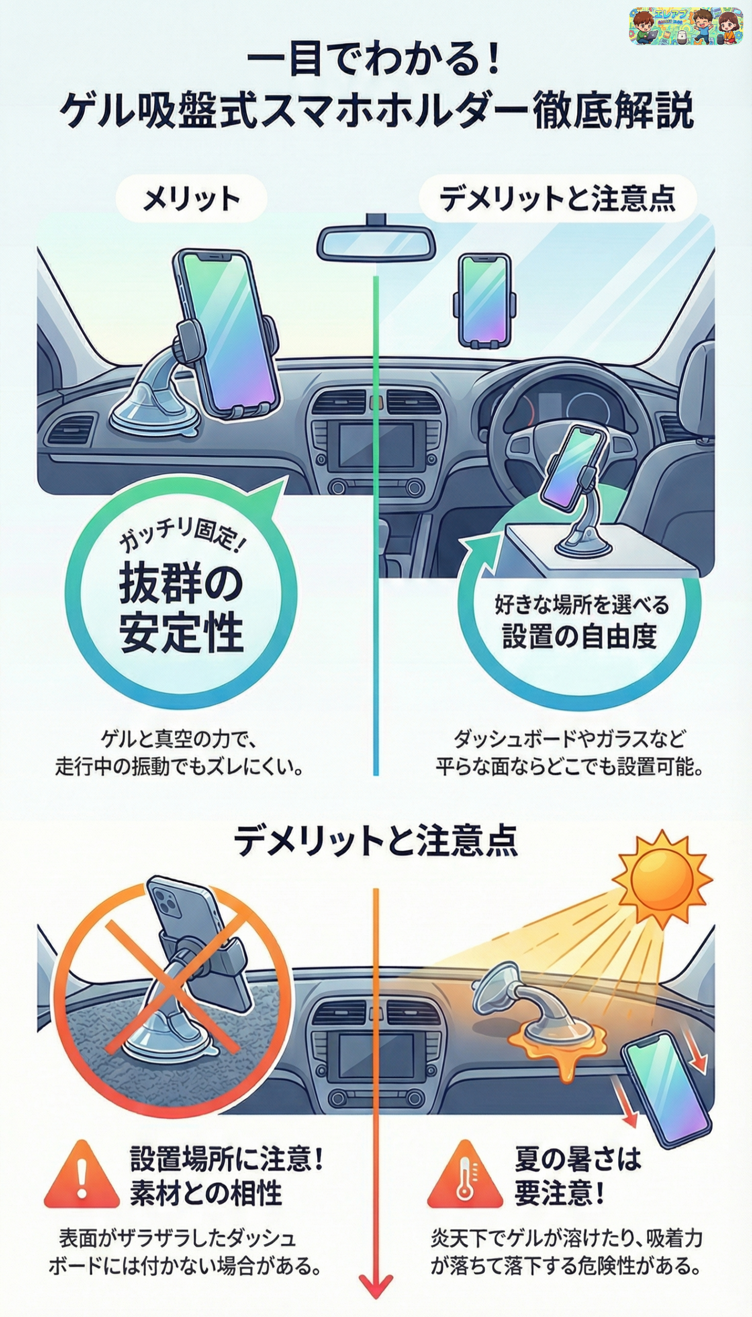 - 夏の暑さへの注意: 真夏の炎天下など、直射日光が長時間当たる環境では吸盤のゲルが熱で溶け、ダッシュボードに跡が残ってしまったり、吸着力が弱まってホルダーごと落下したりする可能性があります。