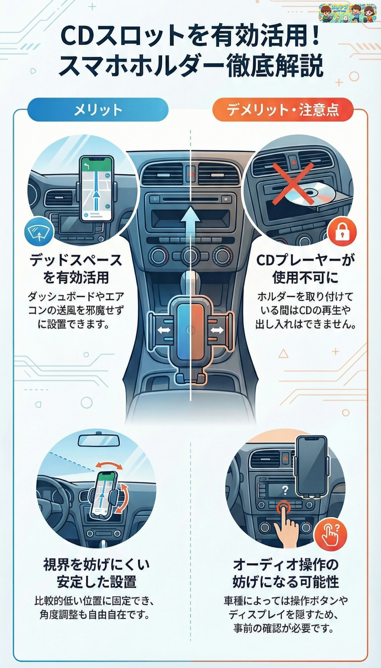 - デッドスペースの活用: 使っていないCDスロットを有効活用できます。ダッシュボード上を塞がず、エアコンの送風も邪魔しないという利点があります。