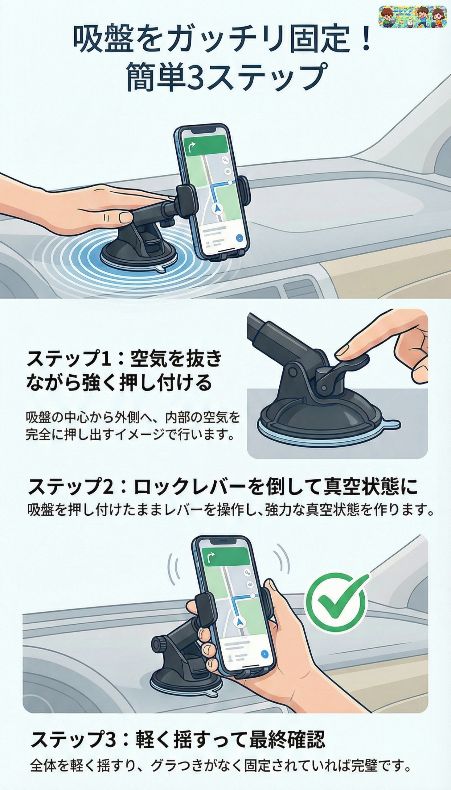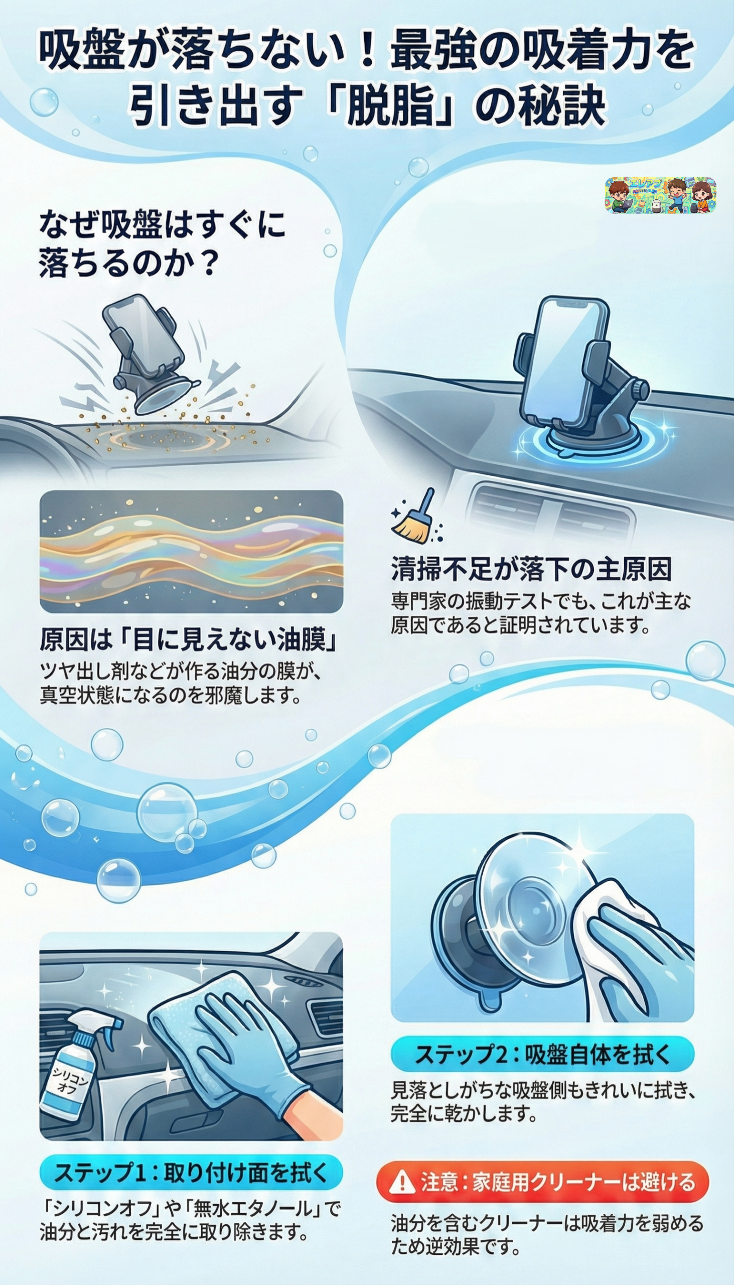 「吸盤がすぐに剥がれてしまう…」その最大の原因は、取り付け面の『目に見えない「油分」や「ホコリ」』です。