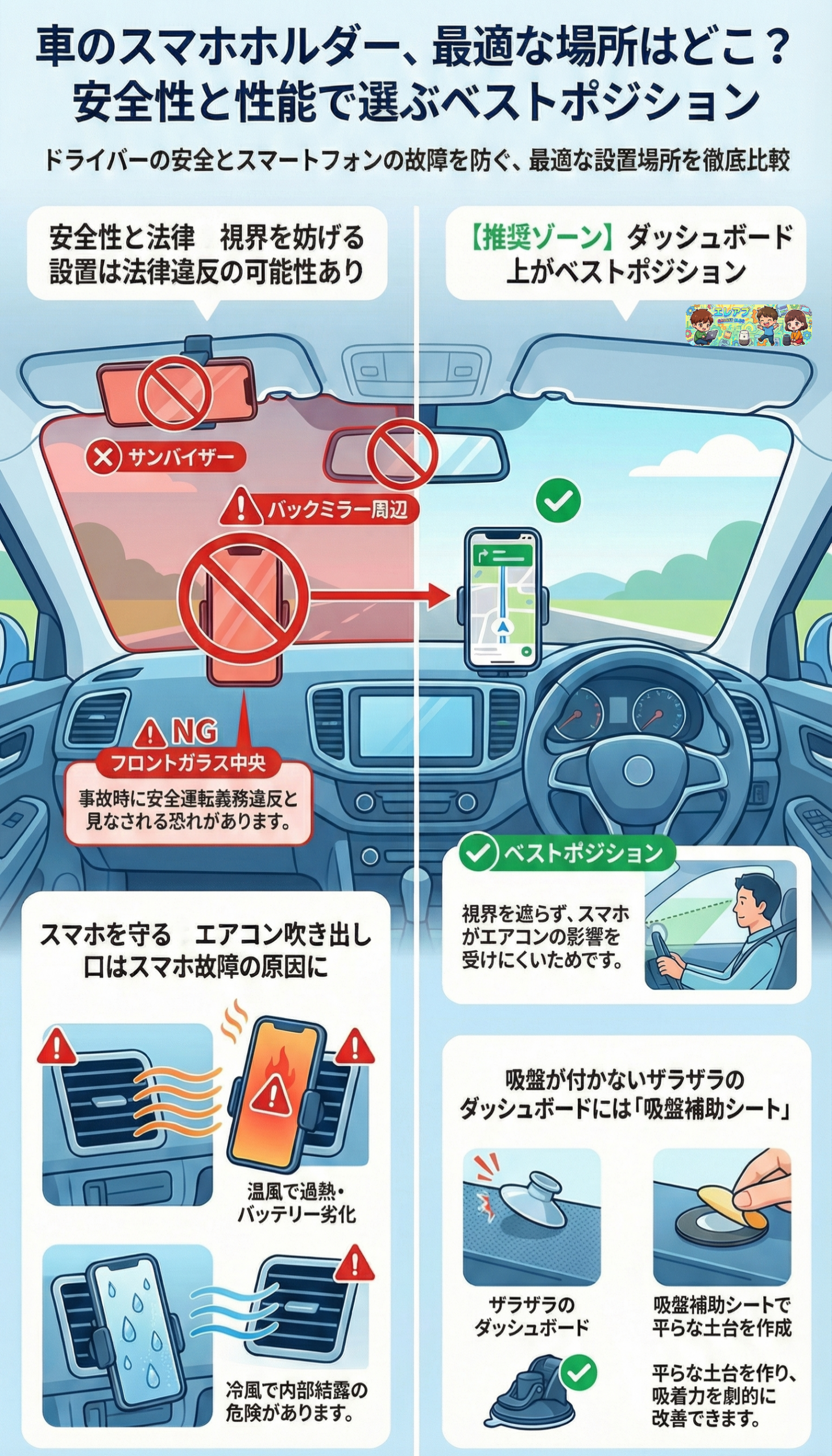 | ダッシュボード | 【推奨】 エアコンの風が直接当たらず、スマホの故障リスク(過熱や内部結露)を避けられます。視界を遮らない低い位置を選びましょう。 |