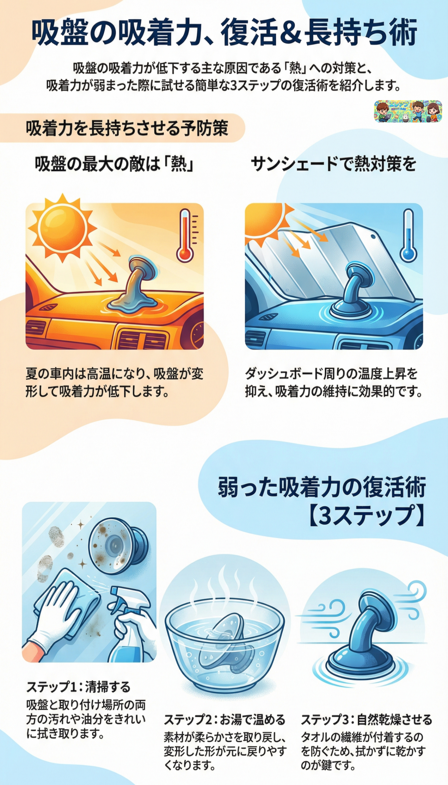 吸着力が弱まった際は、吸盤をお湯で温めて柔らかくしたあと自然乾燥させると、回復することがあるよ!