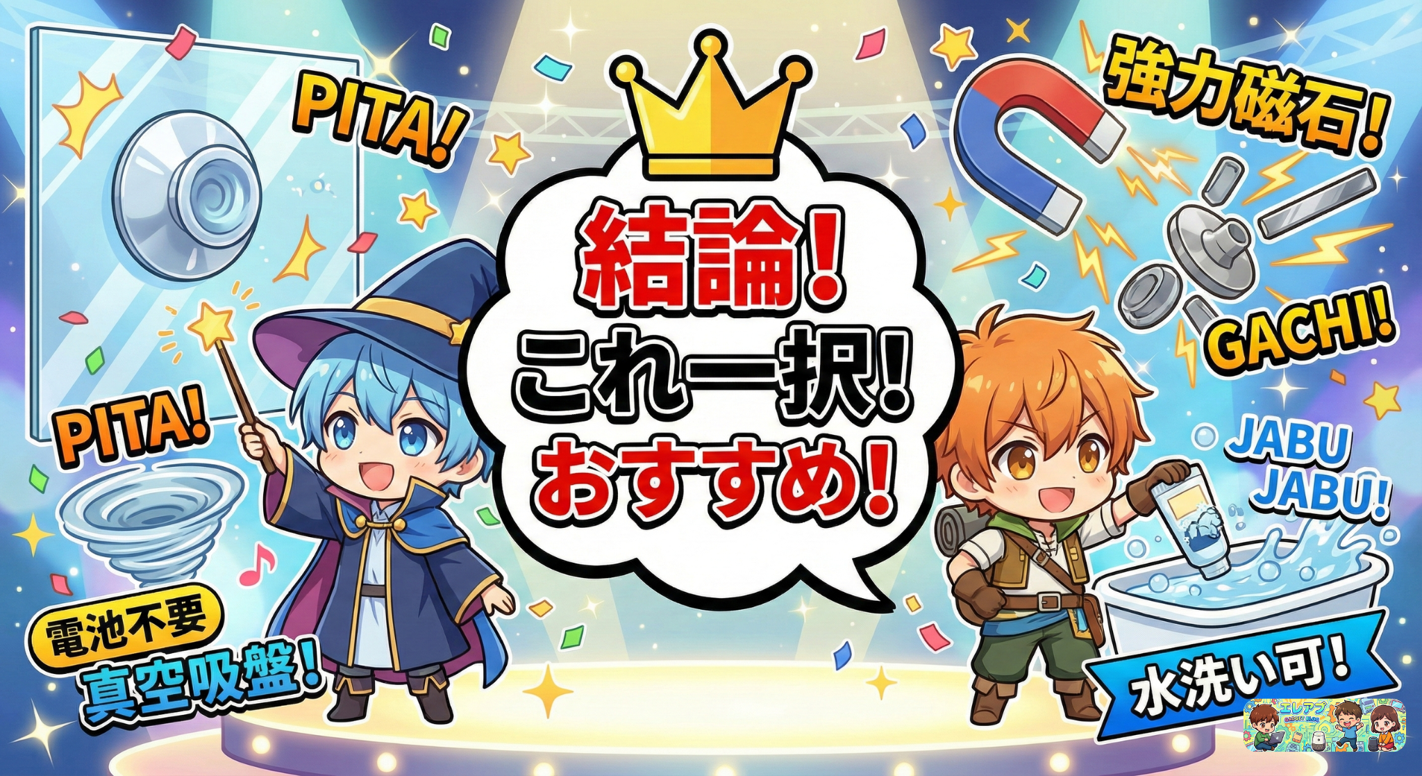【結論】真空吸盤で吸着(電池不要)+強力磁石+水洗い可がおすすめ!