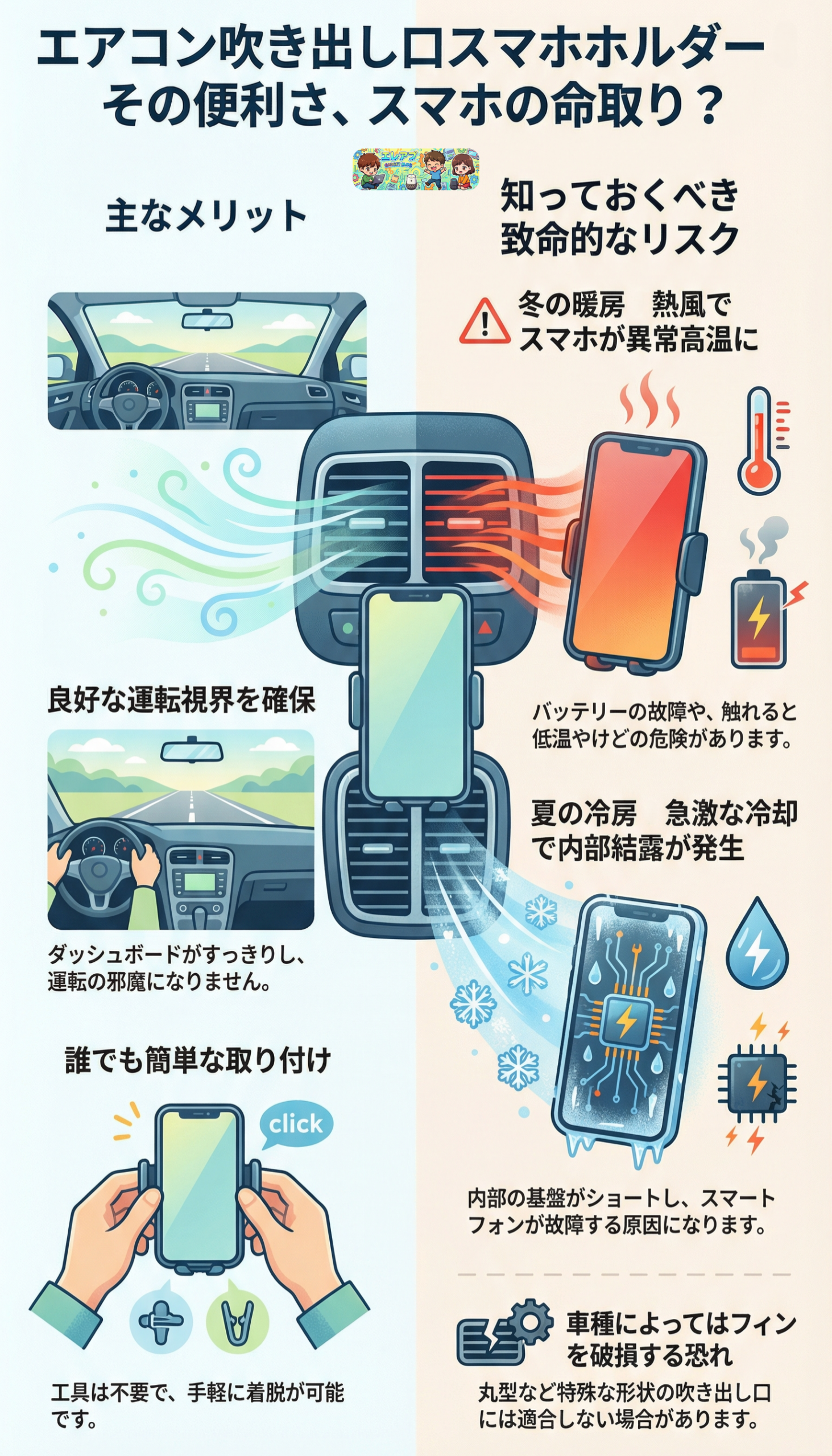 - エアコンの風によるスマホへの致命的な影響(最重要): このタイプを選ぶ上で最も注意すべき点です。スマホは精密な電子機器であり、急激な温度変化に非常に弱いためです。