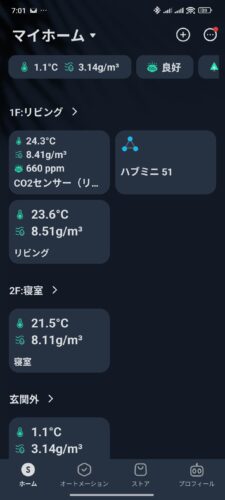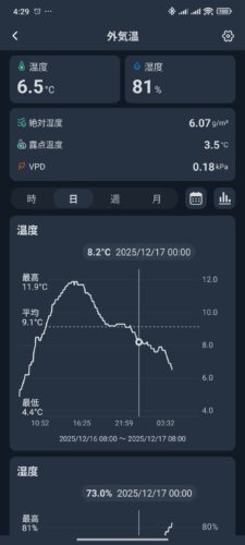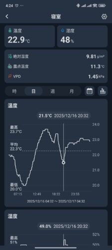 上のスクショは左から「外気温」「1Fリビング(エアコン設置部屋)」「2F寝室(スグダン設置部屋)」です。