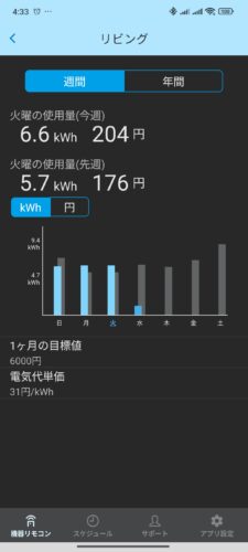 火曜日の履歴は、エアコンだけで6.6kwh。(@31円で204円でした!)もちろん24時間つけっぱなしです!