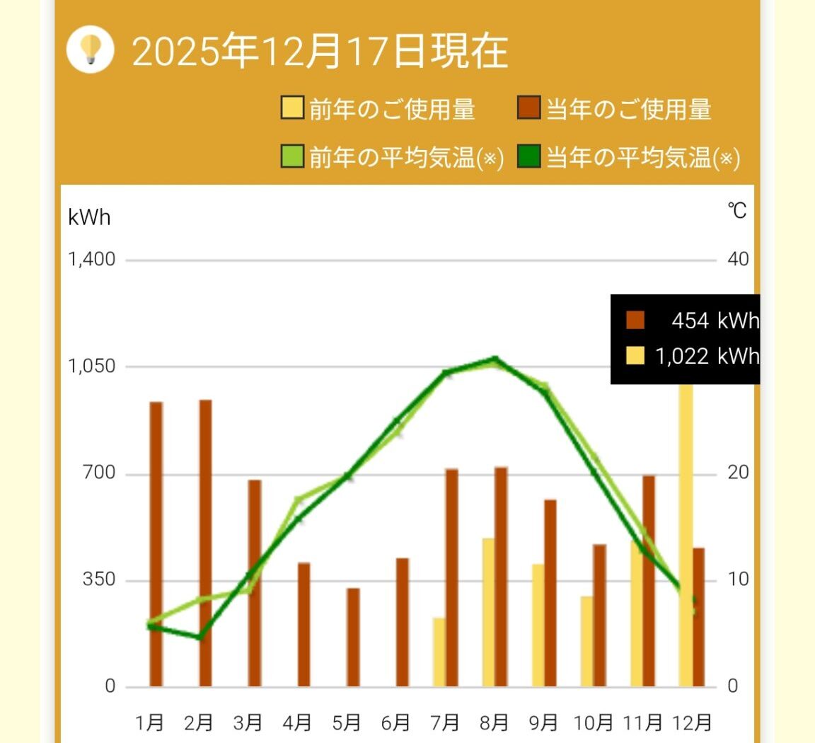 2025年12月は17日時点で454kWh。この調子だと12月は昨年度以下の800~850kWhにおさまりそうなので、うるる機能で加湿暖房するより2割ほど電気代節約になっています!しかも、今年は「スグダン+エアコン+象印スチーム加湿器」つけっぱなしですよ!(੭ु´・ω・`)੭ु⁾⁾