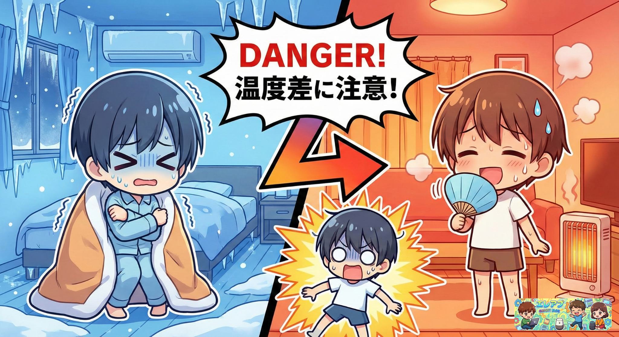 暖かい場所から急に寒い場所へ移動することで血圧が乱高下する「ヒートショック」です。