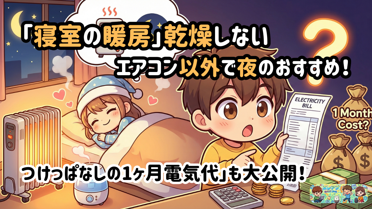 さらに、私が自身の体験と実践して本当によかったと思った『エレアプ流』夜の寝室の暖房で乾燥しないエアコン以外におすすめする器具と、我が家の実践記録をもとに「夜の就寝時に暖房つけっぱなしの電気代」「1日24時間エアコン暖房つけっぱなしの1ヶ月電気代」を大公開します!