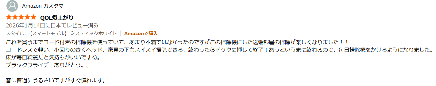 一方で、「音の大きさ」や「バッテリー持ち」については、パワーがある分、少し割り切りが必要なようです。「多少音が大きくても、面倒なメンテナンスから解放されたい!」という方には、間違いなく刺さる掃除機だと言えますね!٩( ”ω” )و