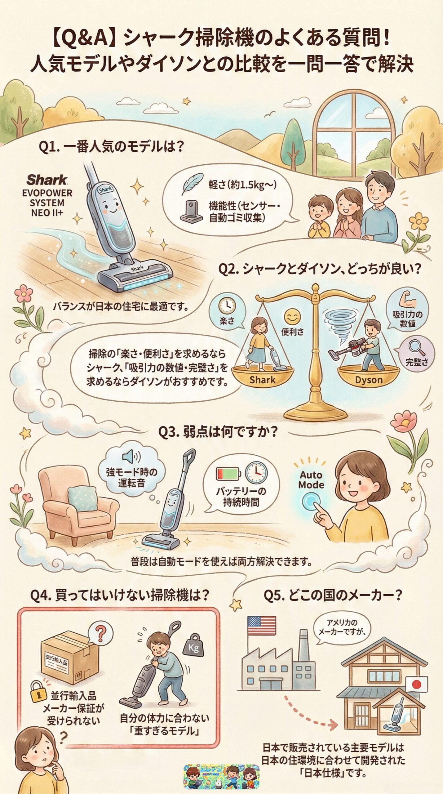最後に、シャーク掃除機についてみんなが気になっている疑問を、一問一答形式でサクッと解決しちゃいます!(`・ω・´)ゞ