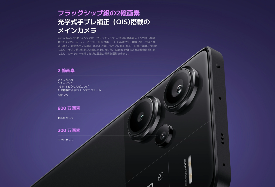 Redmi Note 13 Pro+のマーケティングの目玉は、印象的な2億画素(200MP)のメインカメラセンサーです。