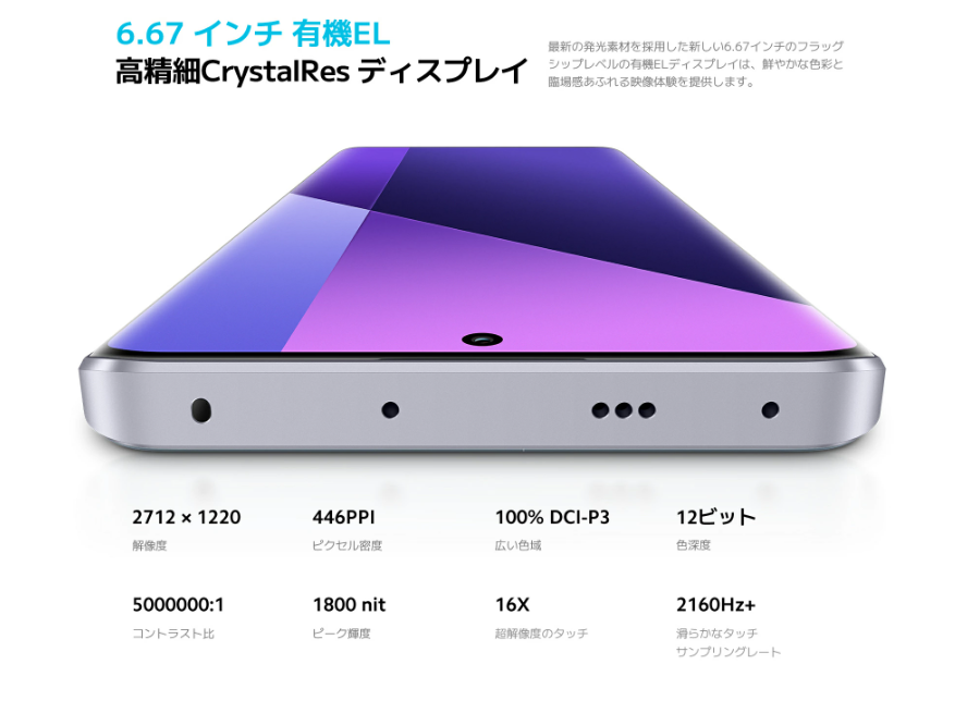- 解像度: 1.5K (2712 x 1220ピクセル、446PPI)。これは一般的なFHD+よりも高精細です。