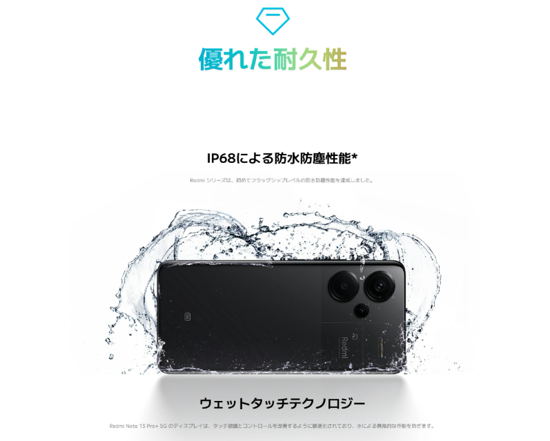 Redmi Note 13 Pro+ 5Gは、充電速度と環境耐久性において、Pro 5Gよりも優位なフラッグシップ級のアップグレードがされています。