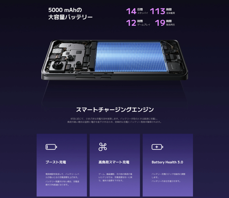 この機能により、0%から100%までのフル充電が、わずか19分という驚異的な速さで完了します(「充電速度をブースト」機能を有効にした場合)。