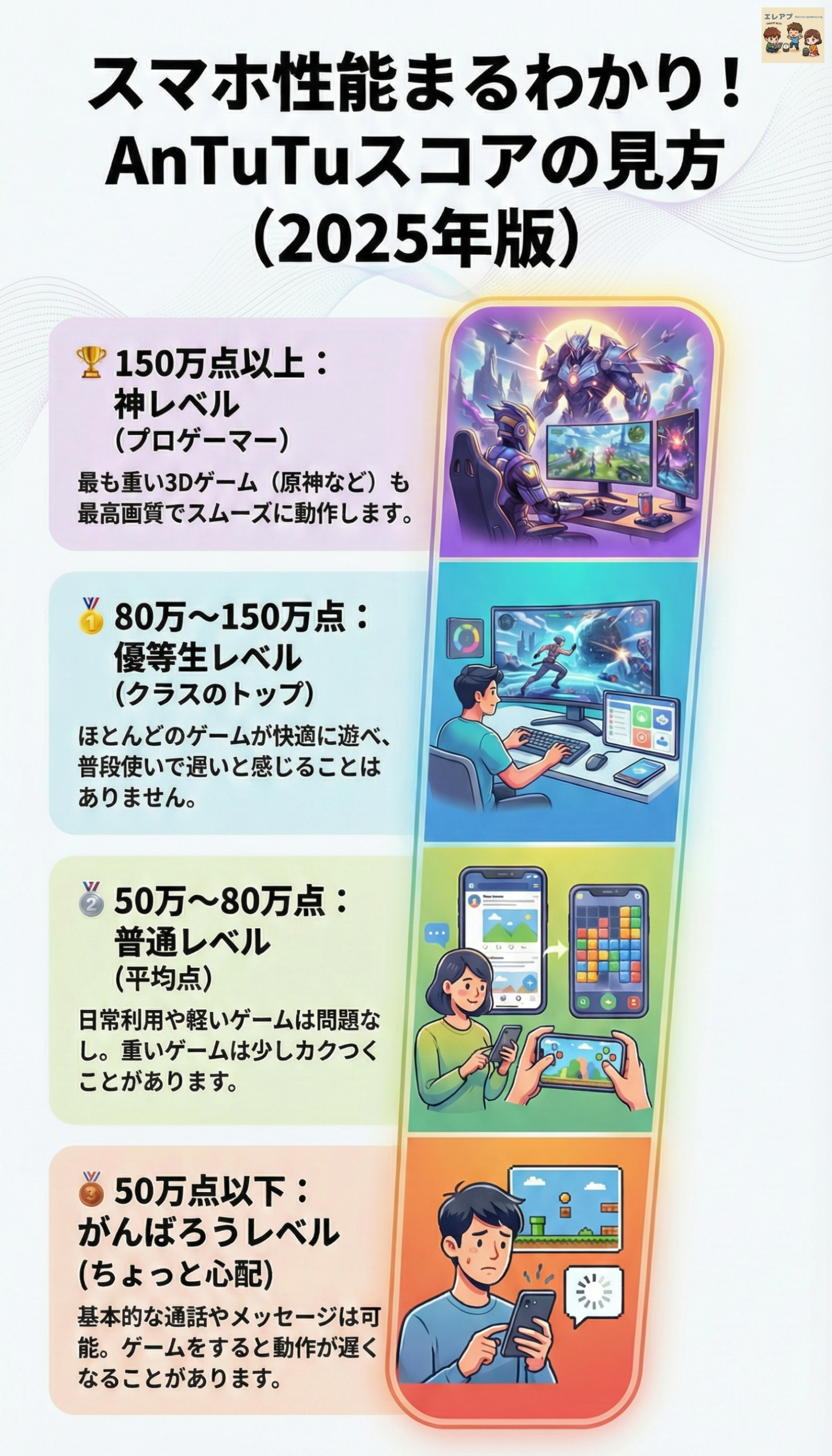 - 📊 「戦闘力(せんとうりょく)」がわかるアニメやゲームに出てくる「強さの数値」みたいなものです。この点数が高いほど、何をやっても速くて、固まらない最強のスマホだということです。