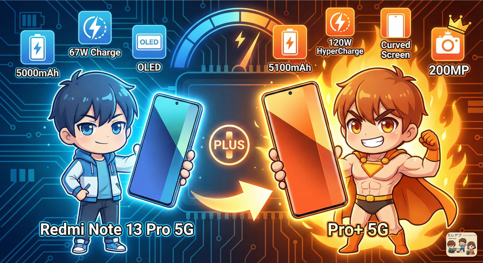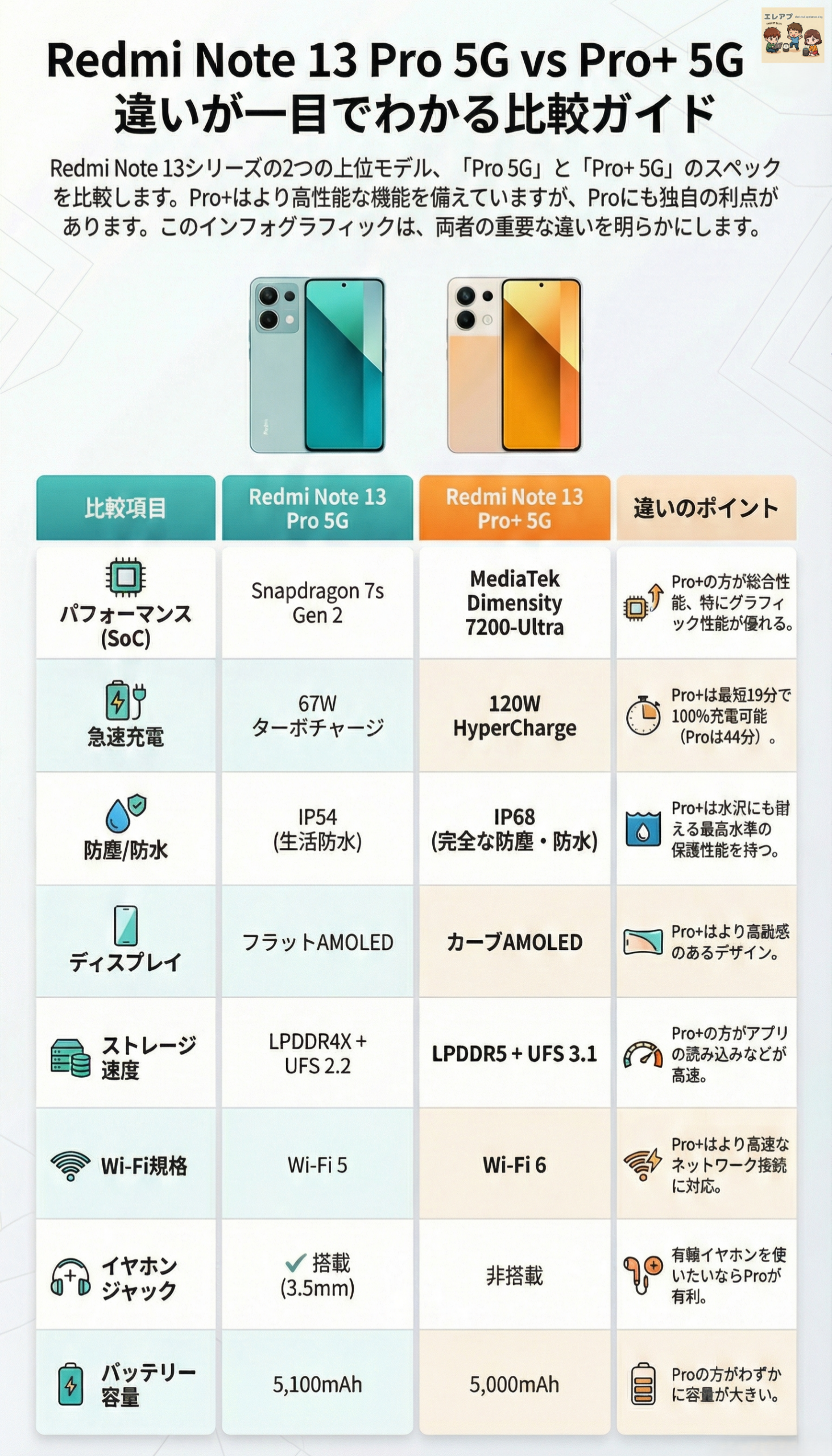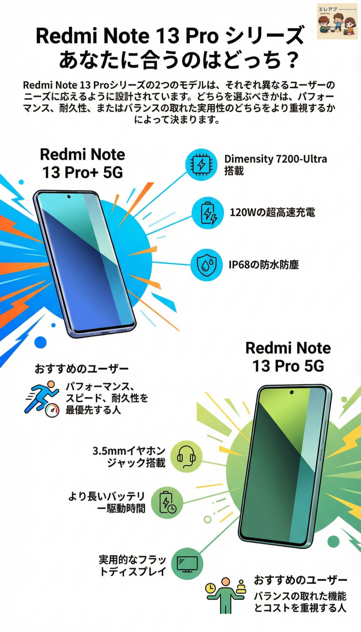 Redmi Note 13 Pro 5Gと上位モデルであるRedmi Note 13 Pro+ 5Gは、多くの共通のハイエンド機能を持ちながらも、パフォーマンス、充電速度、耐久性の面で明確な差別化が図られています。