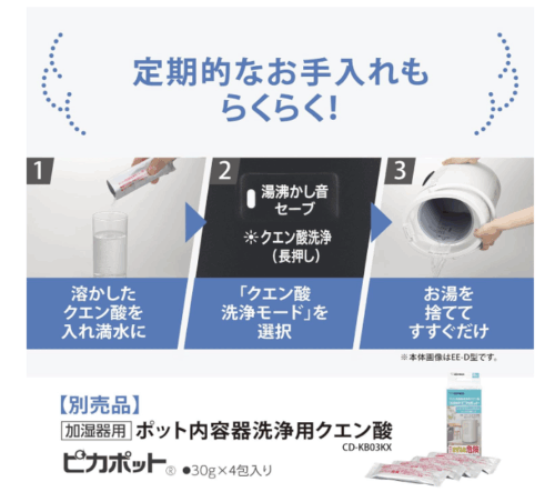 本格的なお手入れは1〜2ヶ月に一度、クエン酸を入れて「クエン酸洗浄モード」のボタンを押すだけ。
