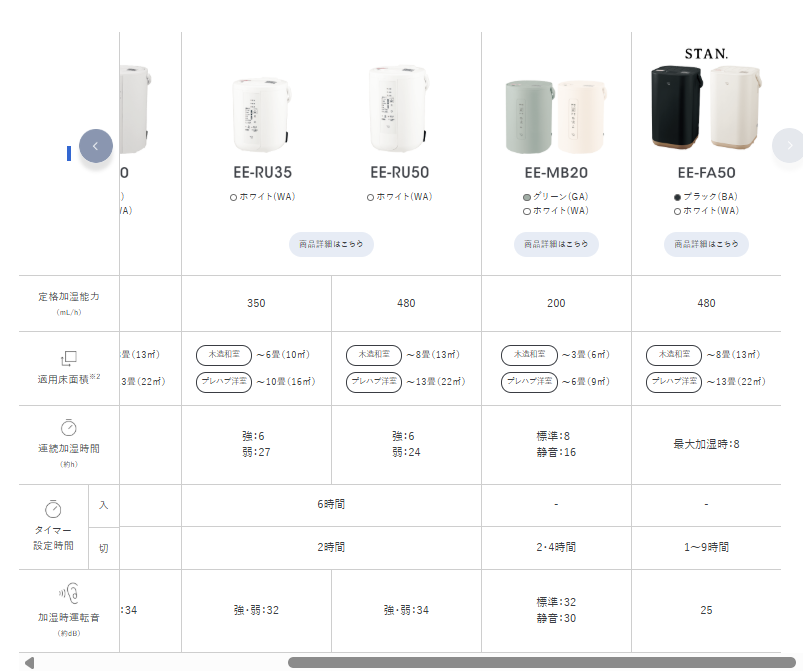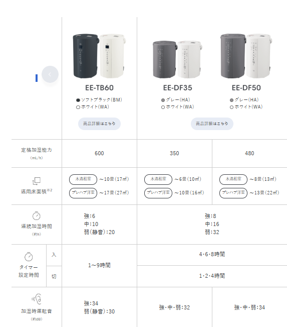 象印「スチーム加湿器」ラインナップ 商品比較より引用