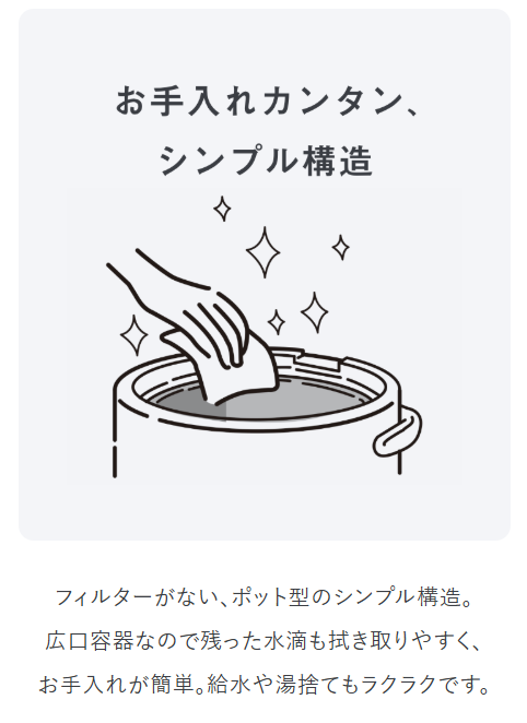 この加湿器では面倒な清掃を要すフィルターが一切ありません。