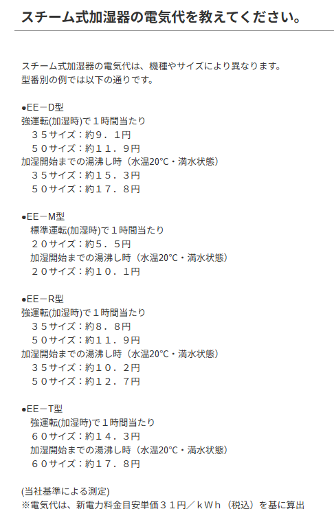 象印のスチーム式加湿器以外に、どんな加湿器があるのかを理解した上で、次に一番気になるところは、やはり電気代がいくら掛かるのか?ですよね!